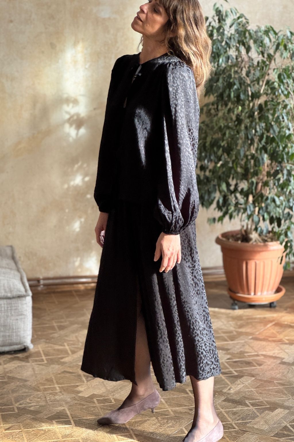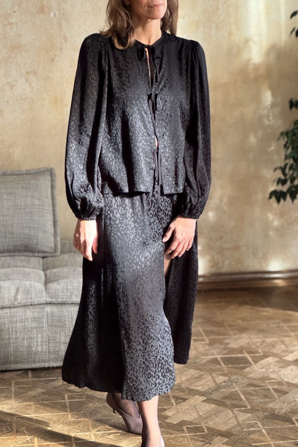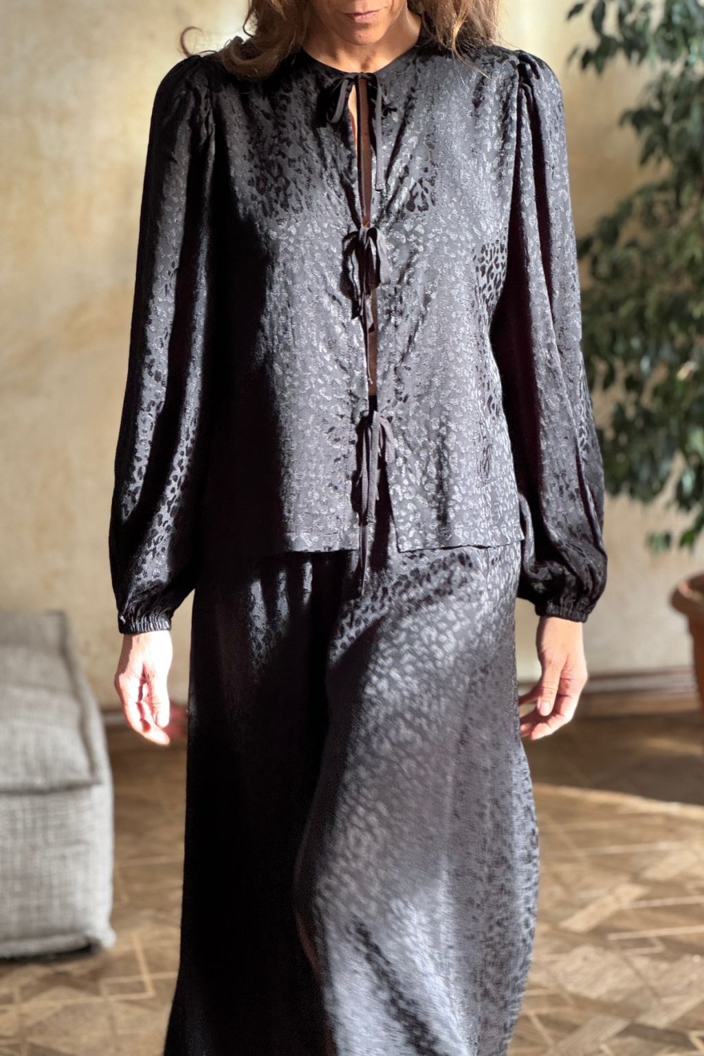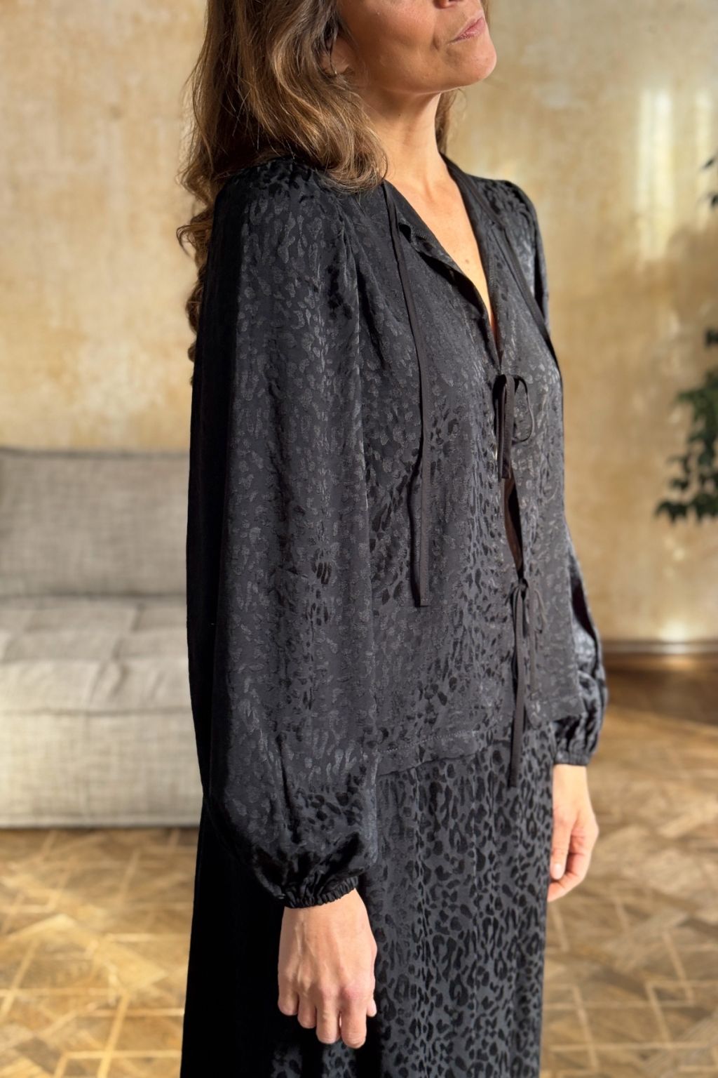Koszula w zwierzęcy print o luźnym fasonie, uszyta z wysokiej wiskozy. Rękawki są bufiaste i zakończone gumeczkami dzięki czemu bluzka zdecydowanie wpisuje się w aktualne trendy. Z przodu wiązana jest na troczki co daje jej oryginalnego charakteru. Tworzy świetną całość z naszą spódnicą uszytą z tego samego materiału.
