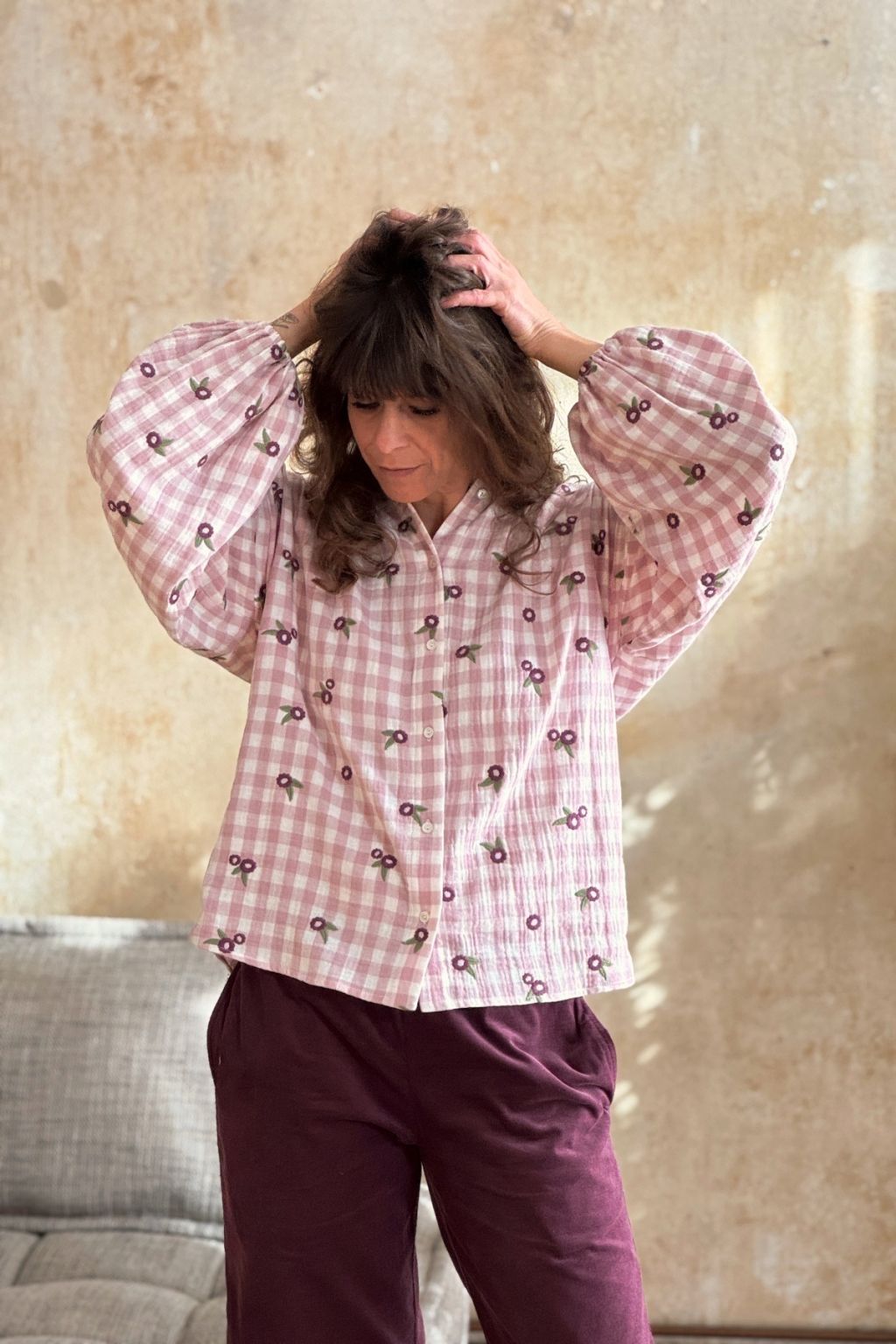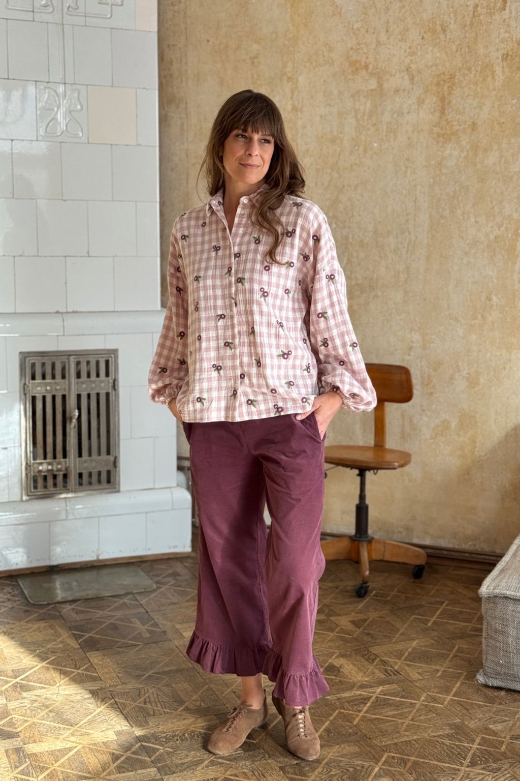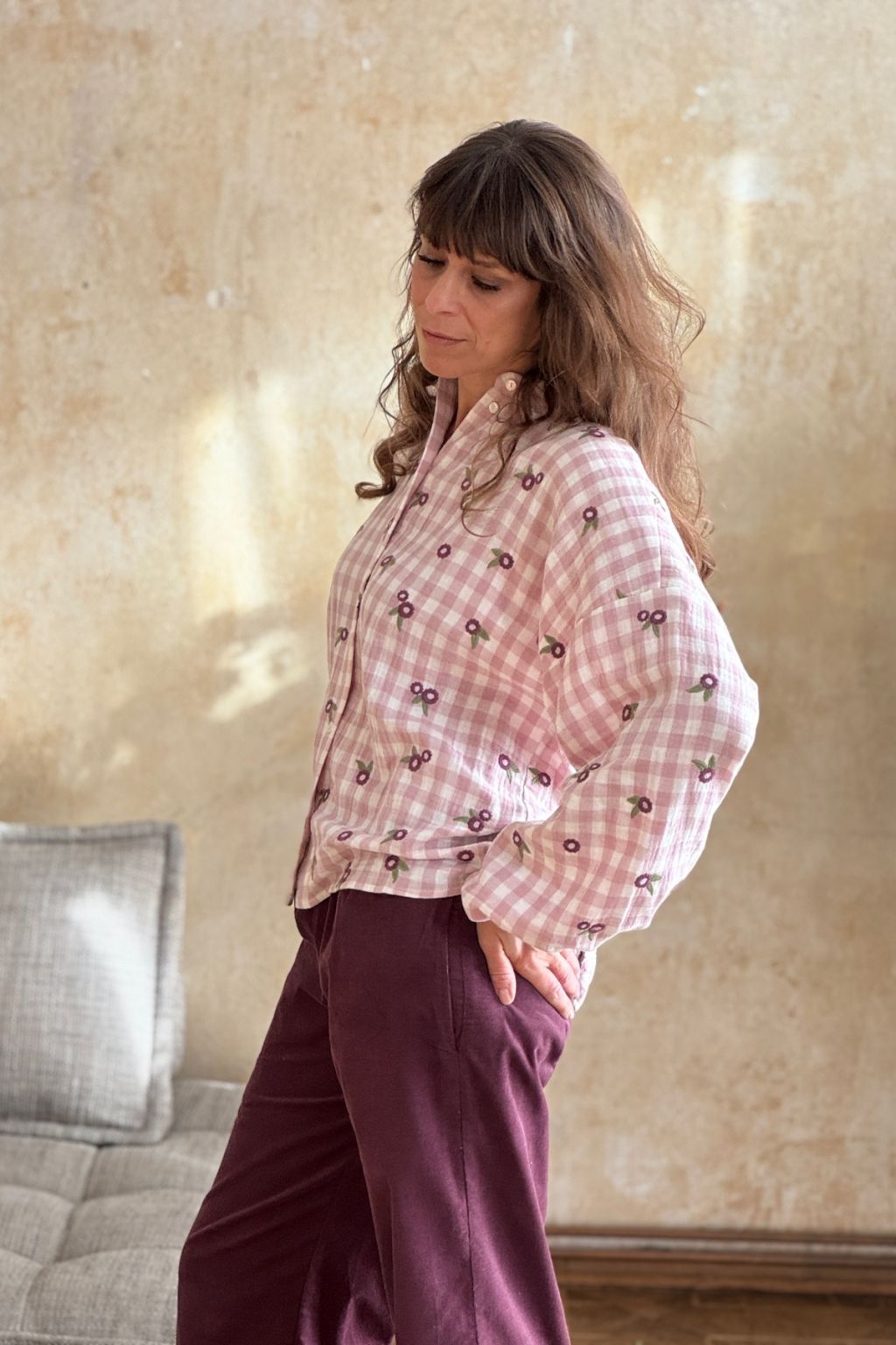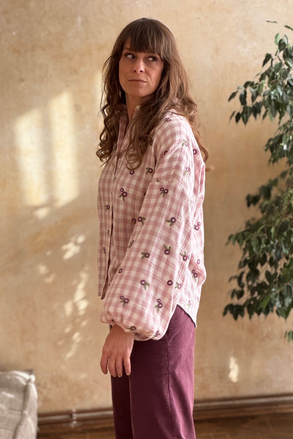 Oversizeowa koszula w stylu boho w haftowane kwiaty. Zapinana na perłowe guziki. Szersze, balonowe rękawy zakończony gumką. Uszyta z bawełnianego muślinu w kratkę. Świetnie się nosi z naszymi sztruksowymi spodniami z falbankami.