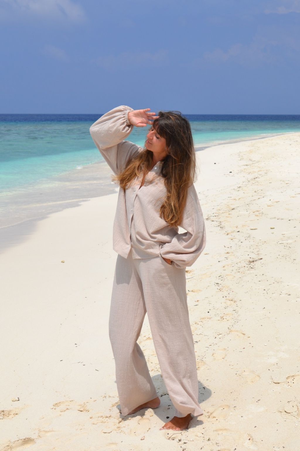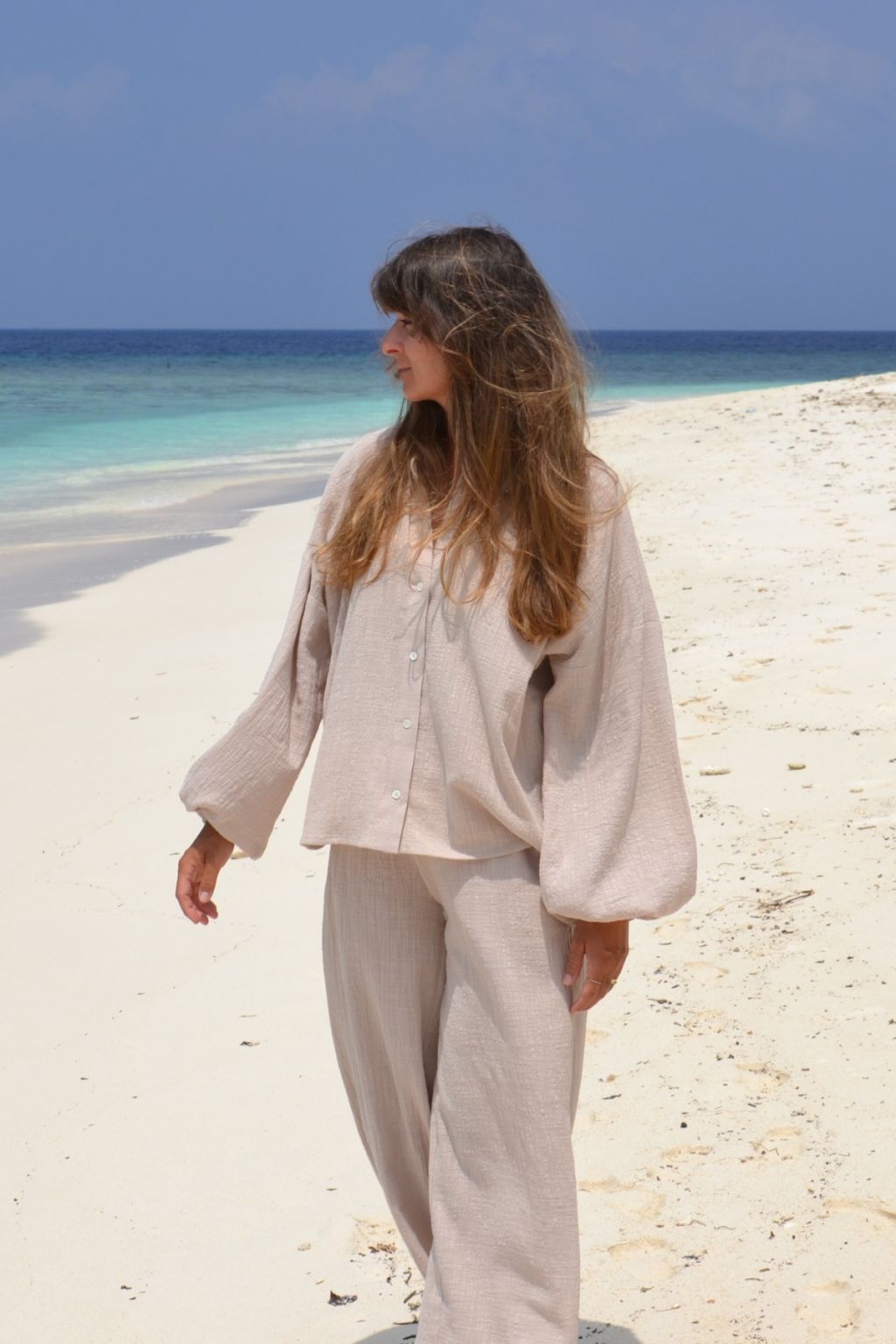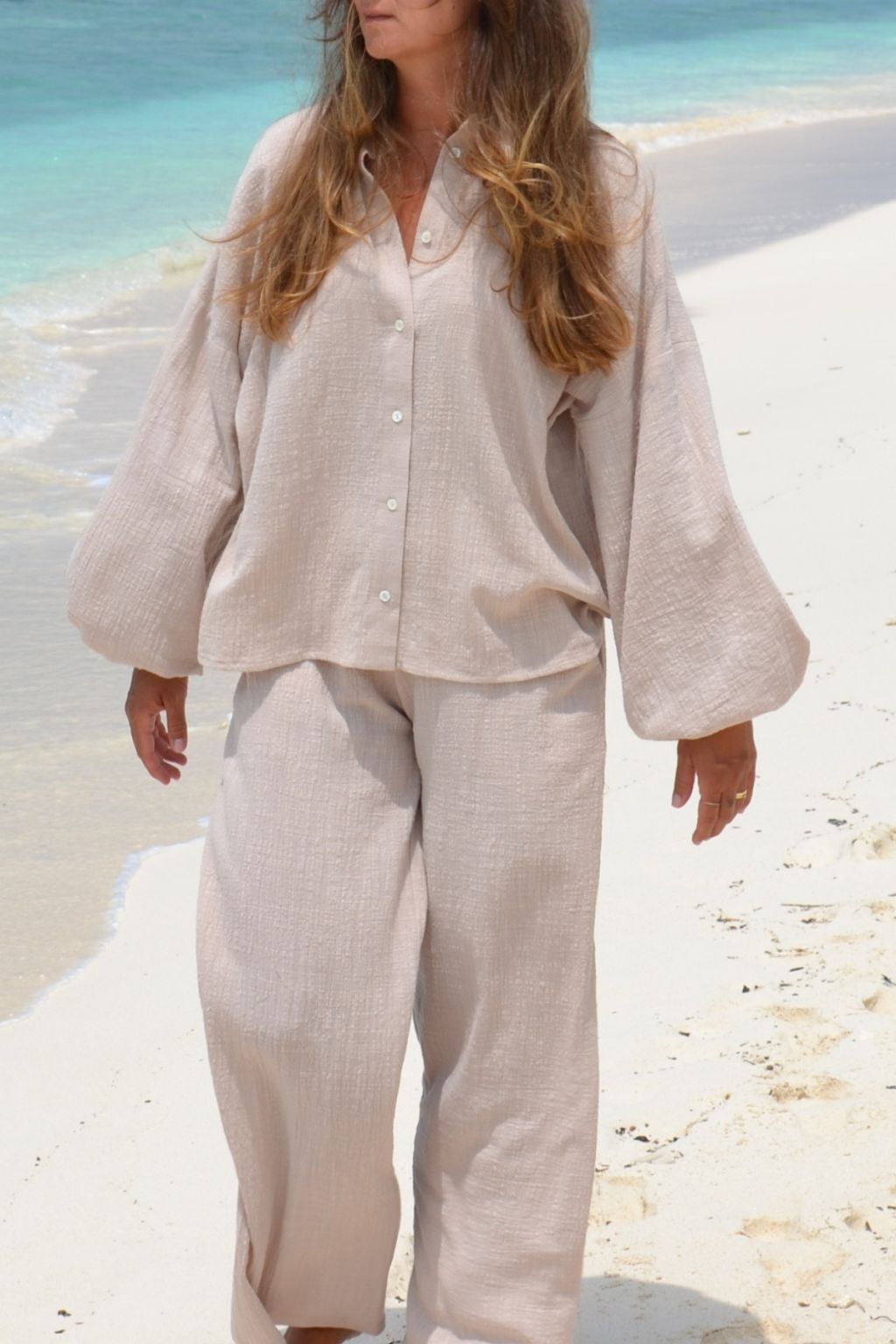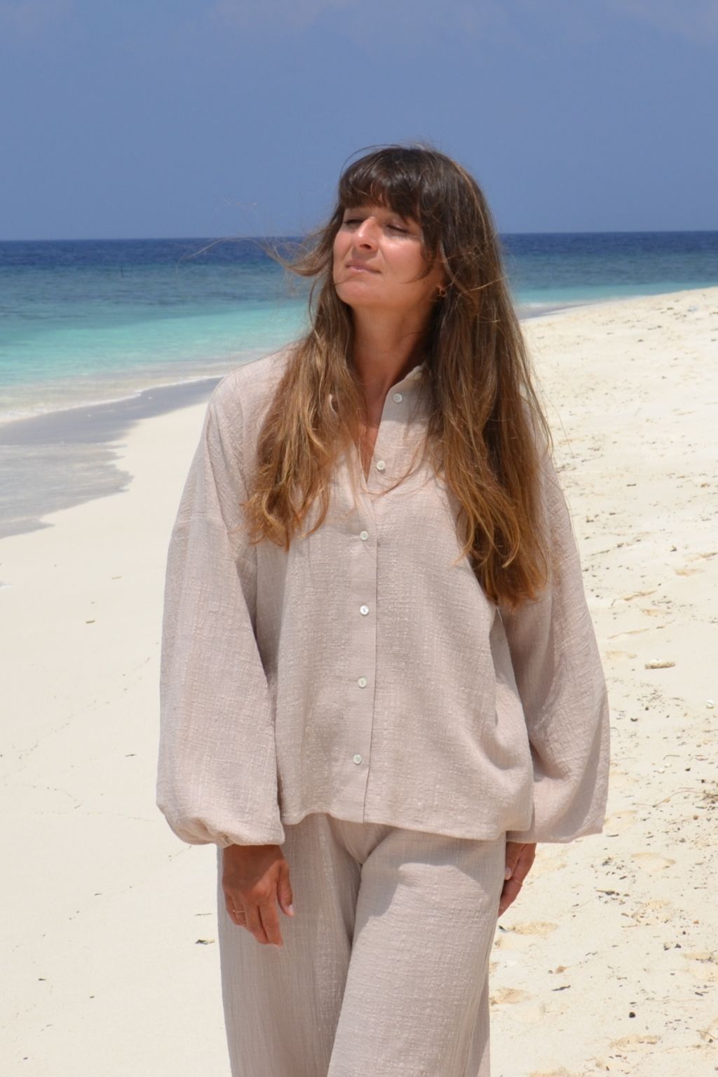 Oversize'owa koszula z szerszymi, balonowymi rękawami zakończonymi nieuciskającą gumką. Z delikatnie wydłużonym tyłem. Zapinana na perłowe guziki. Uszyta z miękkiej bawełnianej tkaniny ze strukturą lnu. Materiał ten łączy w sobie komfort bawełny i estetykę lnu. Koszula świetnie się nosi z naszymi spodniami palazzo uszytymi z tego samego materiału.