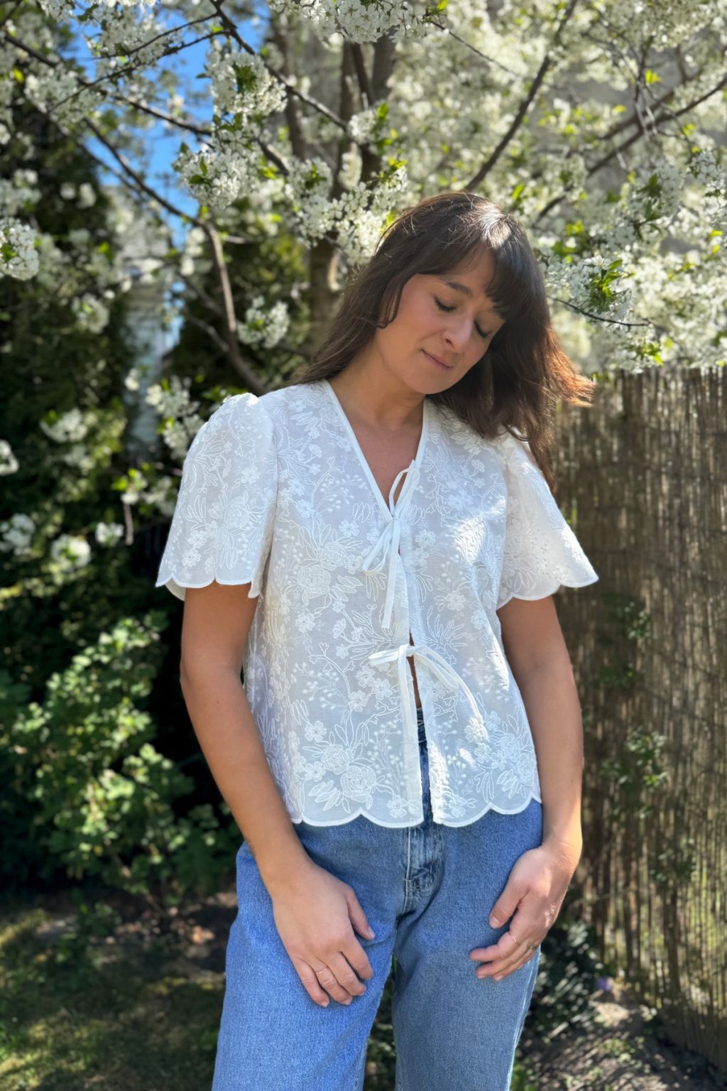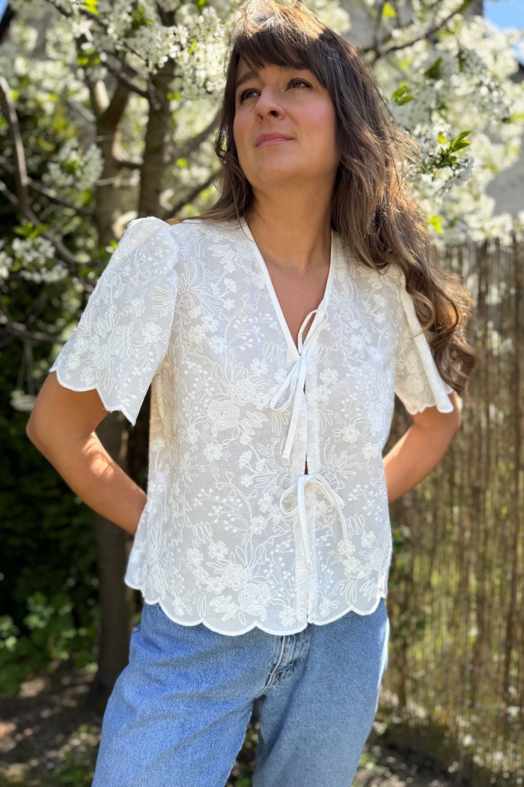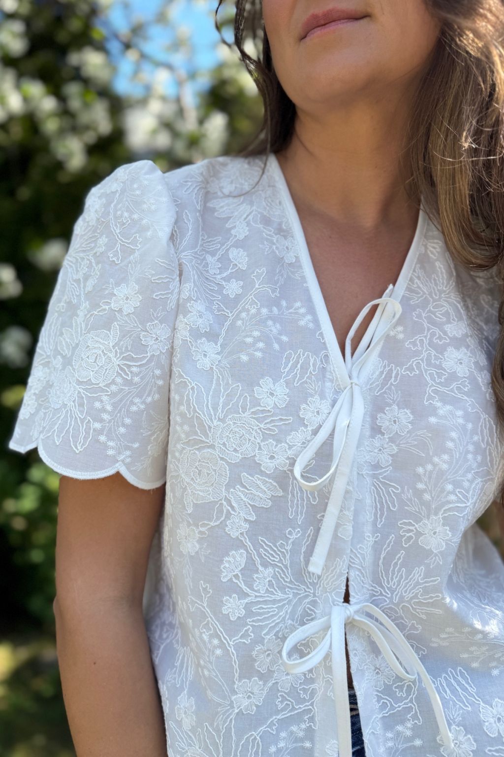 Biała koszula uszyta z wysokiej jakości haftowanej bawełny. Dół i krótki rękawy zakończone ozdobnym, haftowanym brzegiem. Rękawki są bufiaste. Przód wiązany na troczki daje jej oryginalnego charakteru. Dekolt w kształcie litery "V" wysmukla sylwetkę i pięknie odsłania szyję.