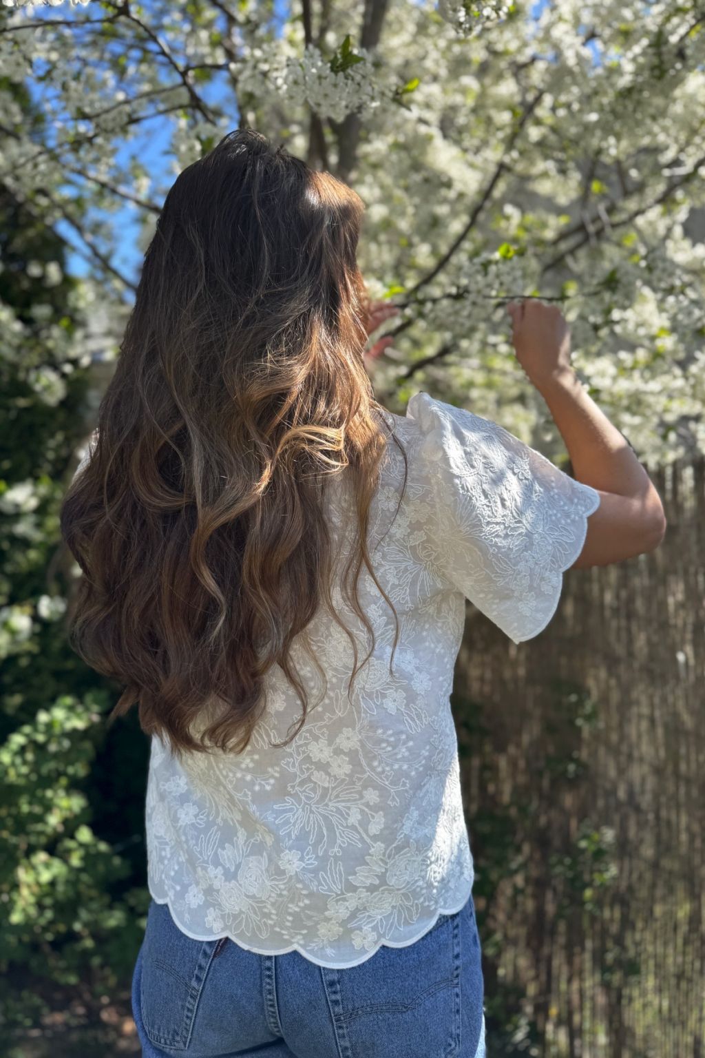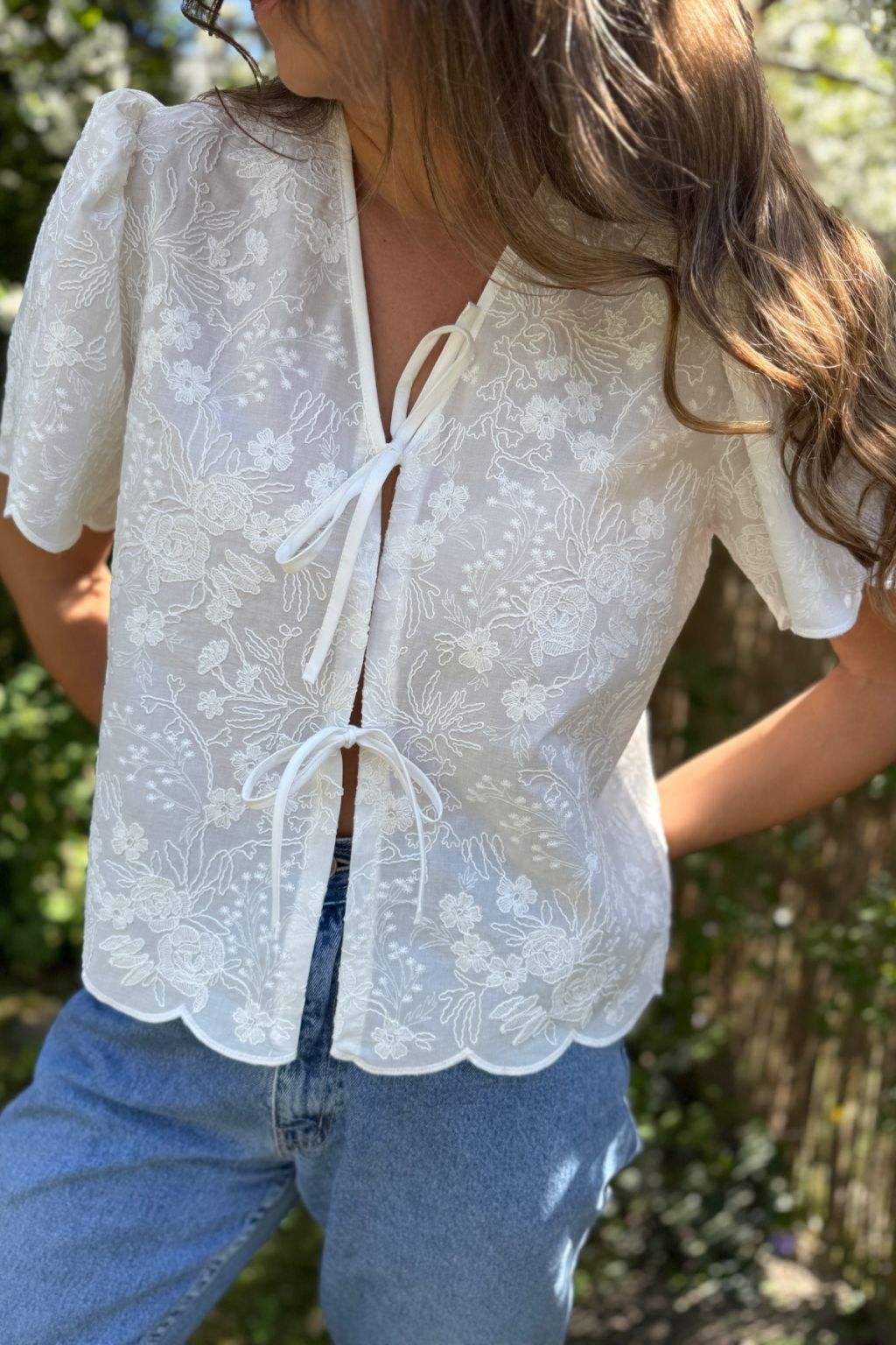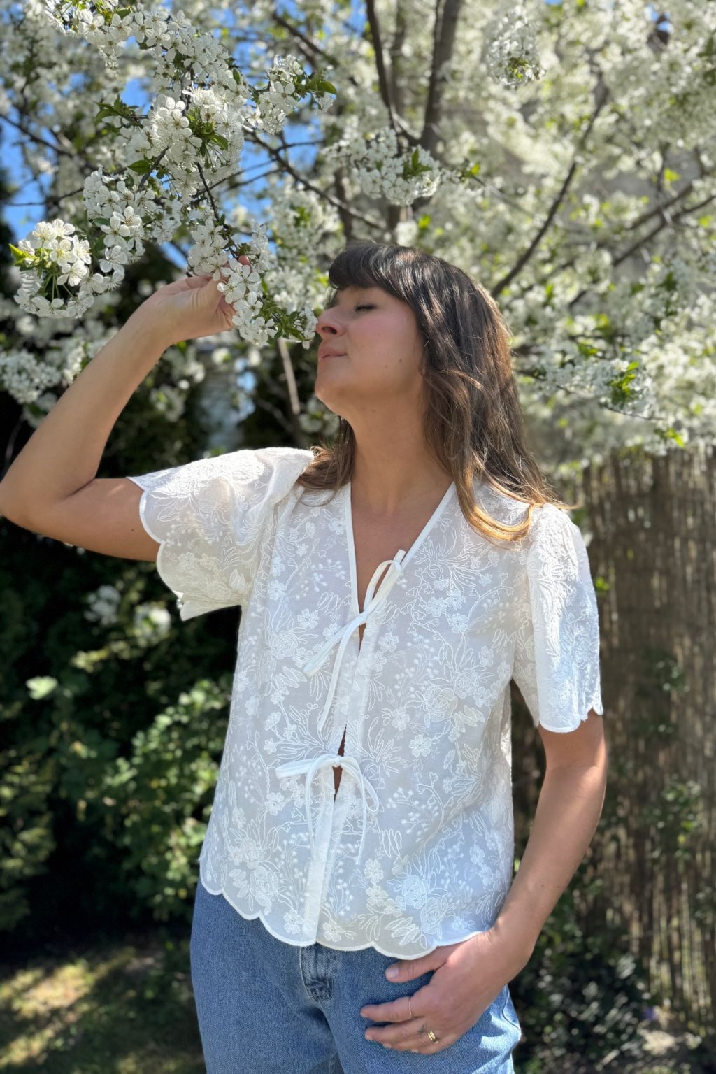 Biała koszula uszyta z wysokiej jakości haftowanej bawełny. Dół i krótki rękawy zakończone ozdobnym, haftowanym brzegiem. Rękawki są bufiaste. Przód wiązany na troczki daje jej oryginalnego charakteru. Dekolt w kształcie litery "V" wysmukla sylwetkę i pięknie odsłania szyję.