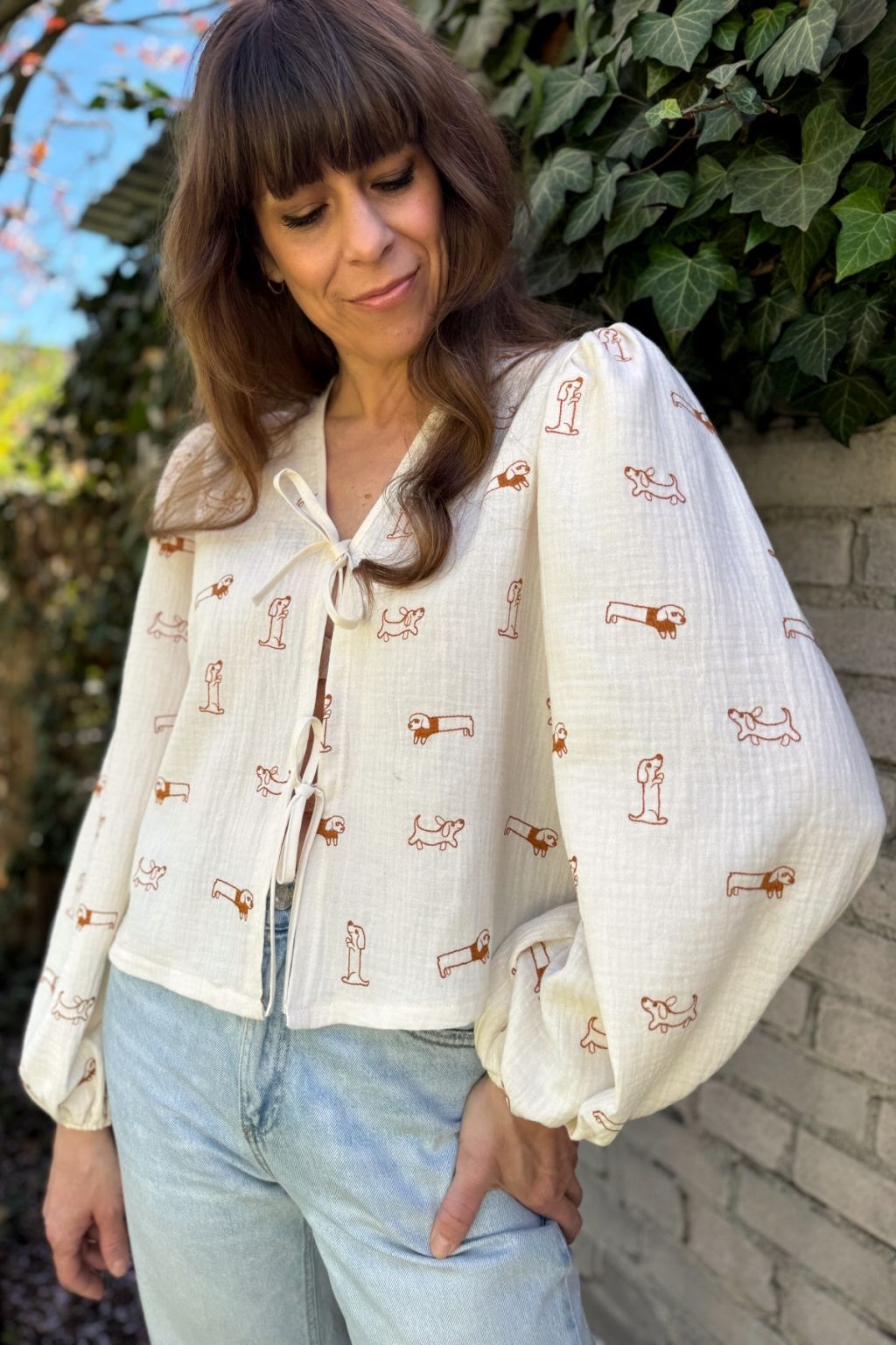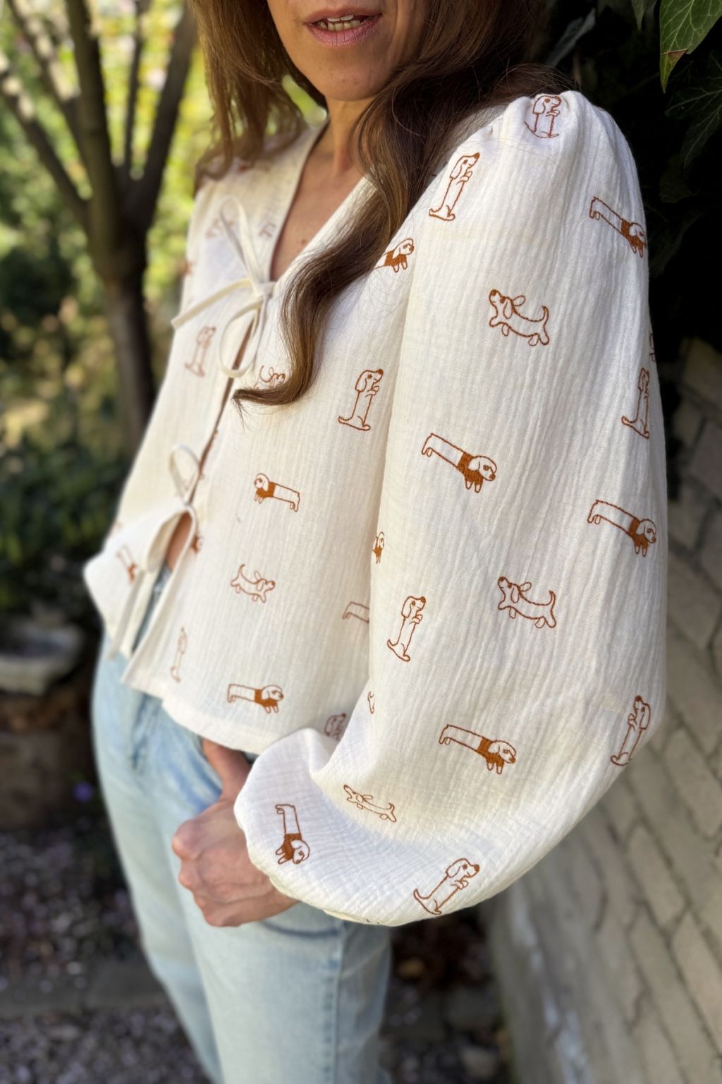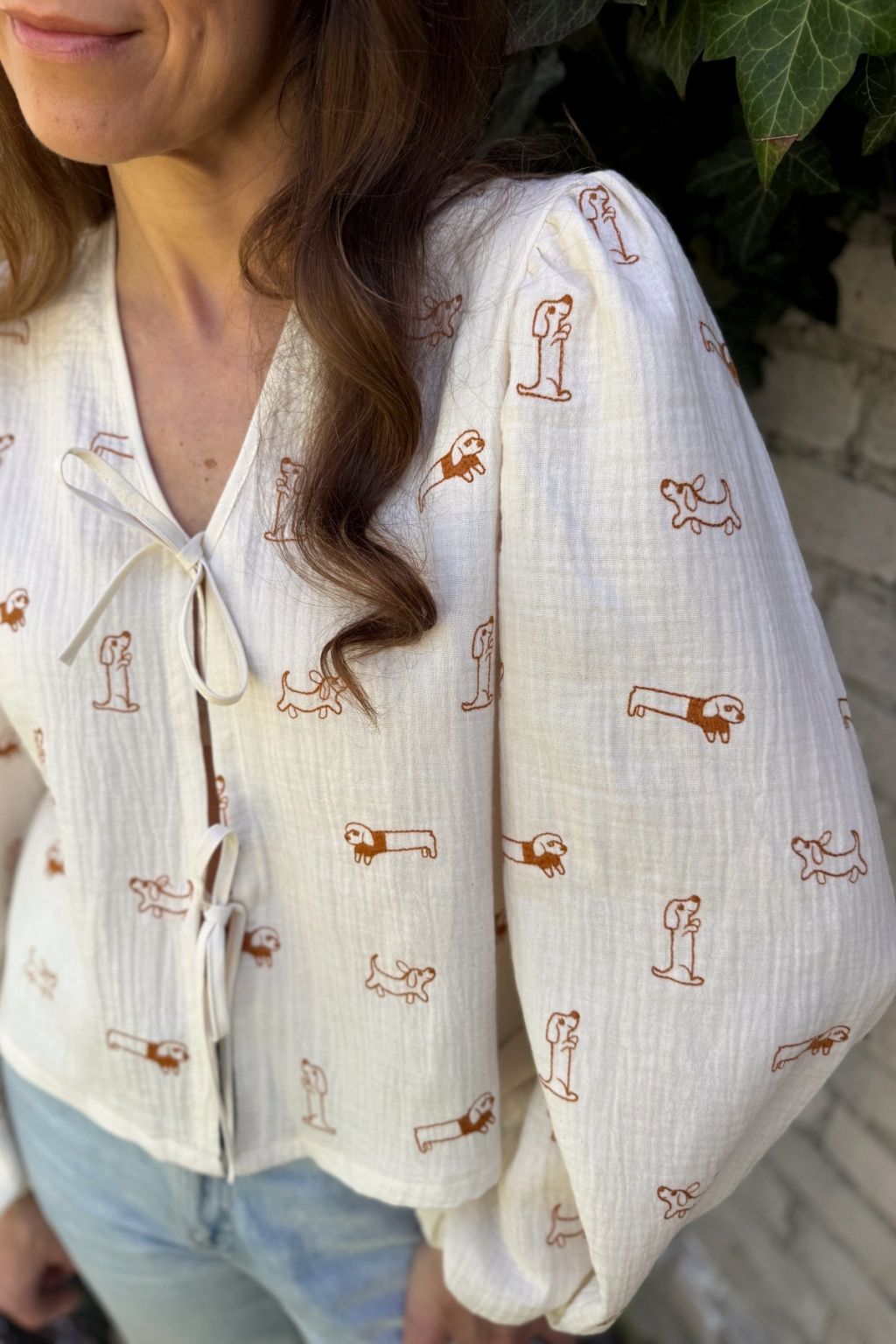 Koszula o luźnym fasonie uszyta z wysokiej jakości muślinu w haftowane pieski. Rękawki są bufiaste i zakończone gumeczkami dzięki czemu bluzka zdecydowanie wpisuje się w aktualne trendy. Z przodu wiązana jest na troczki co daje jej oryginalnego charakteru. Dekolt V wysmukla sylwetkę. Koszula jest w kolorze ecru, a pieski są w kolorze karmelowym.