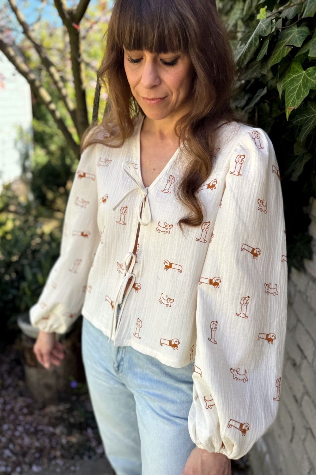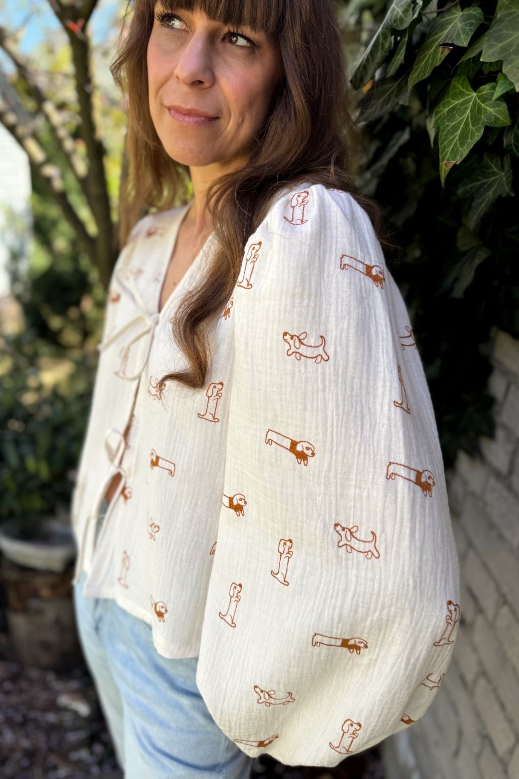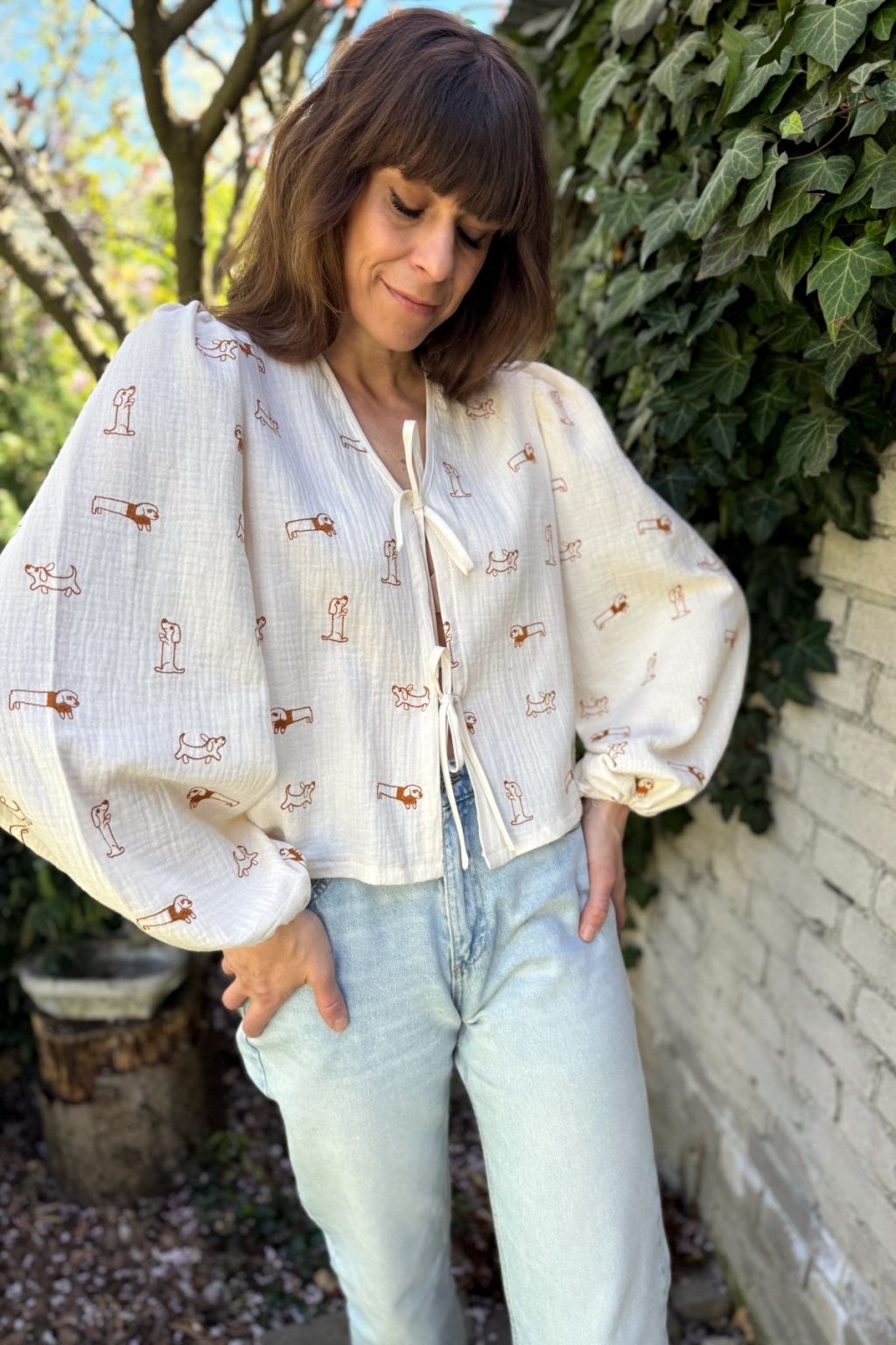 Koszula o luźnym fasonie uszyta z wysokiej jakości muślinu w haftowane pieski. Rękawki są bufiaste i zakończone gumeczkami dzięki czemu bluzka zdecydowanie wpisuje się w aktualne trendy. Z przodu wiązana jest na troczki co daje jej oryginalnego charakteru. Dekolt V wysmukla sylwetkę. Koszula jest w kolorze ecru, a pieski są w kolorze karmelowym.