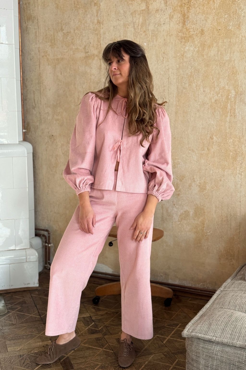 Sztruksowa marynarka w kolorze pudrowego różu o luźnym fasonie uszyta z wysokiej jakości bawełny. Rękawki są bufiaste i zakończone gumeczkami dzięki czemu marynarka zdecydowanie wpisuje się w aktualne, kopenhaskie trendy. Z przodu wiązana jest na troczki co daje jej oryginalnego charakteru. Marynarka świetnie sprawdzi się jako kurtka. Dekolt wiązany jest pod szyję, ale chcąc uzyskać dekolt V górne troczki można swobodnie zawinąć do środka.