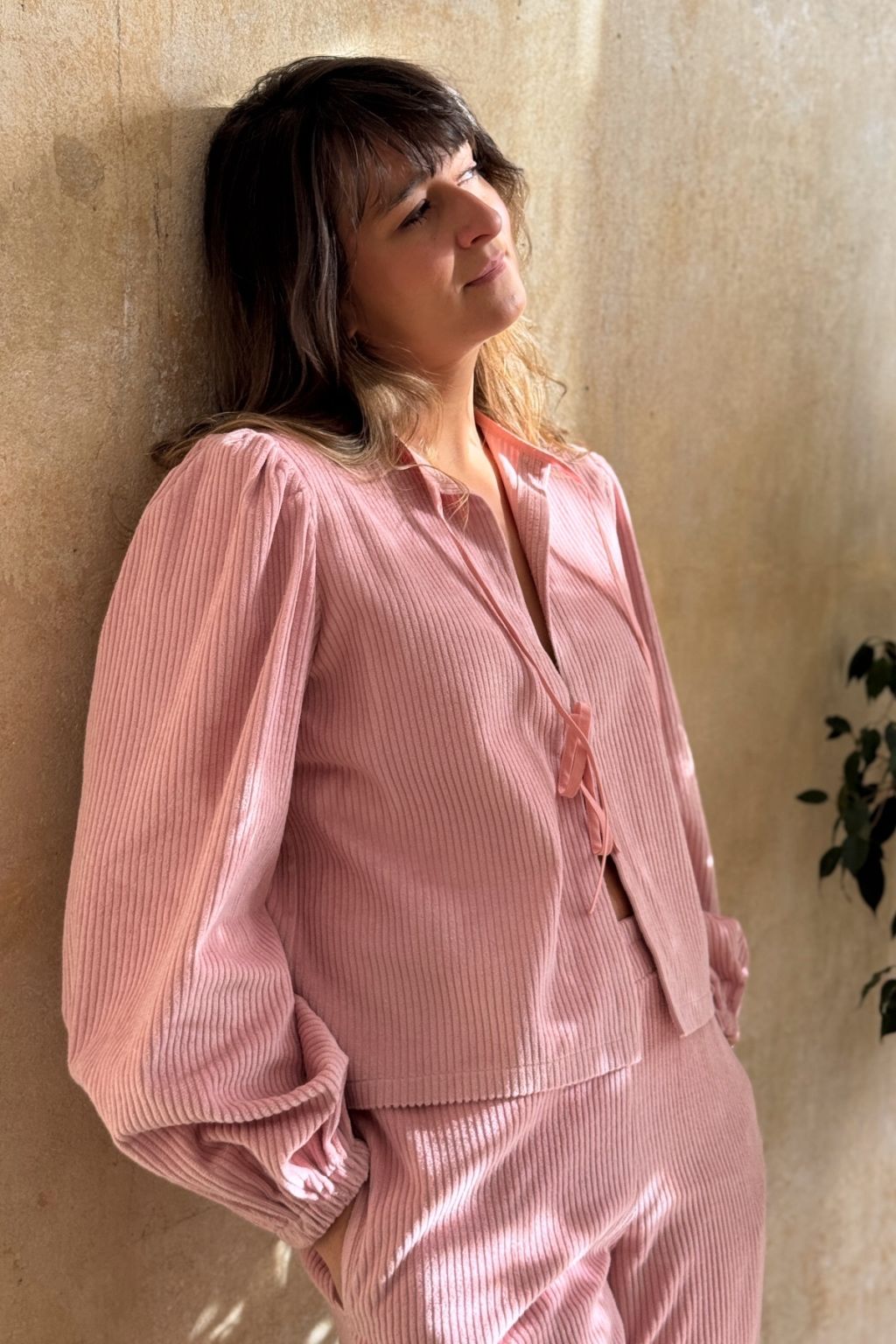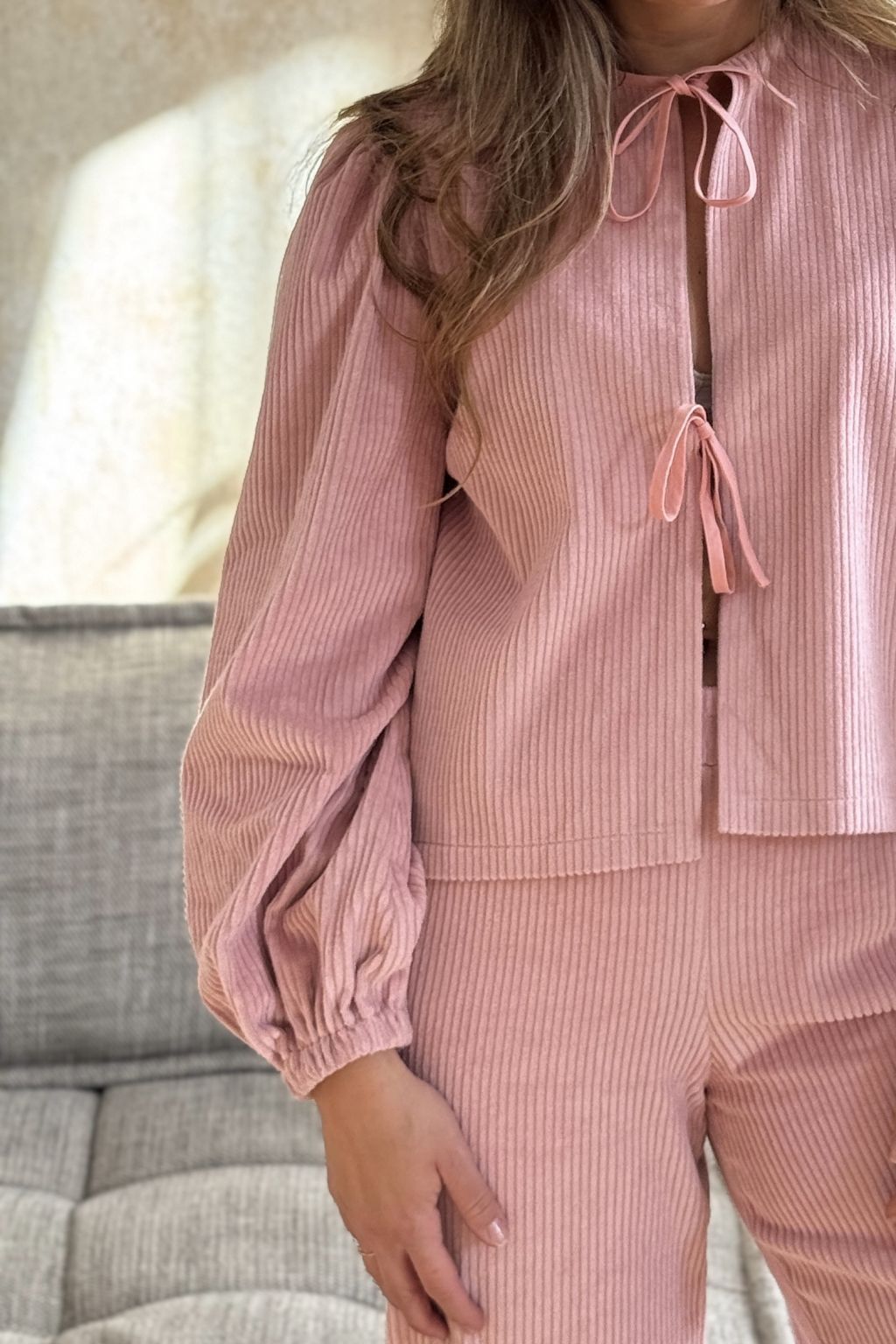 Wiązana sztruksowa marynarka z bufiastymi rękawami
