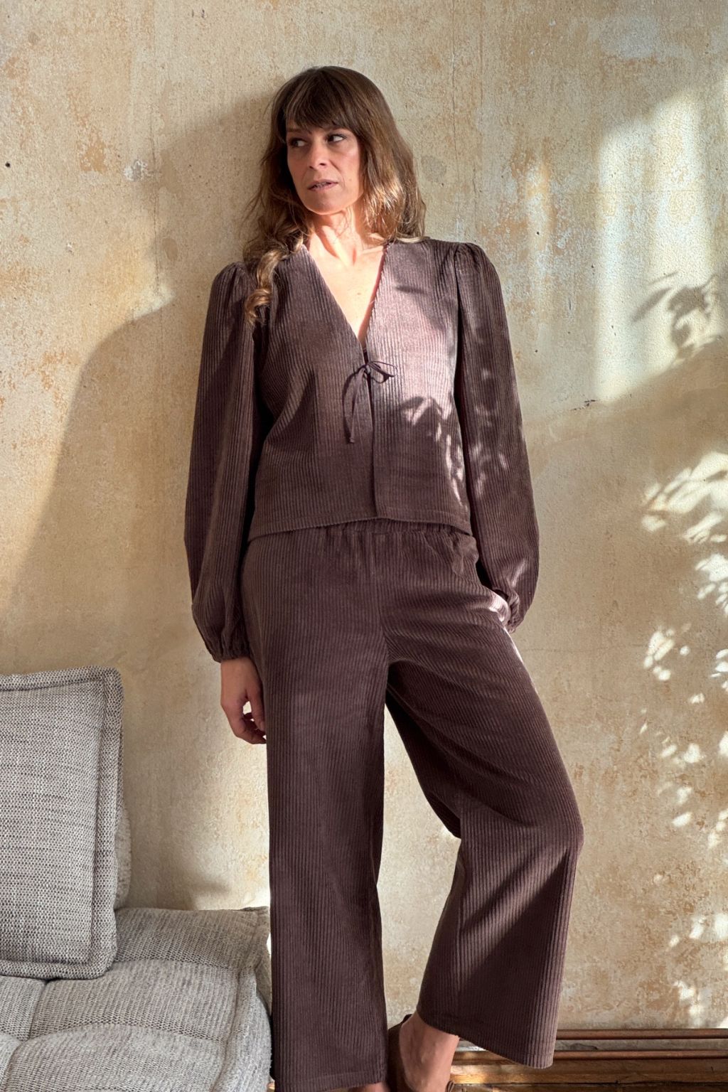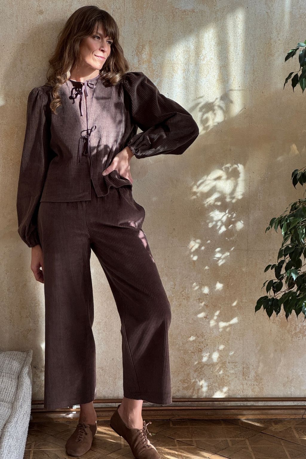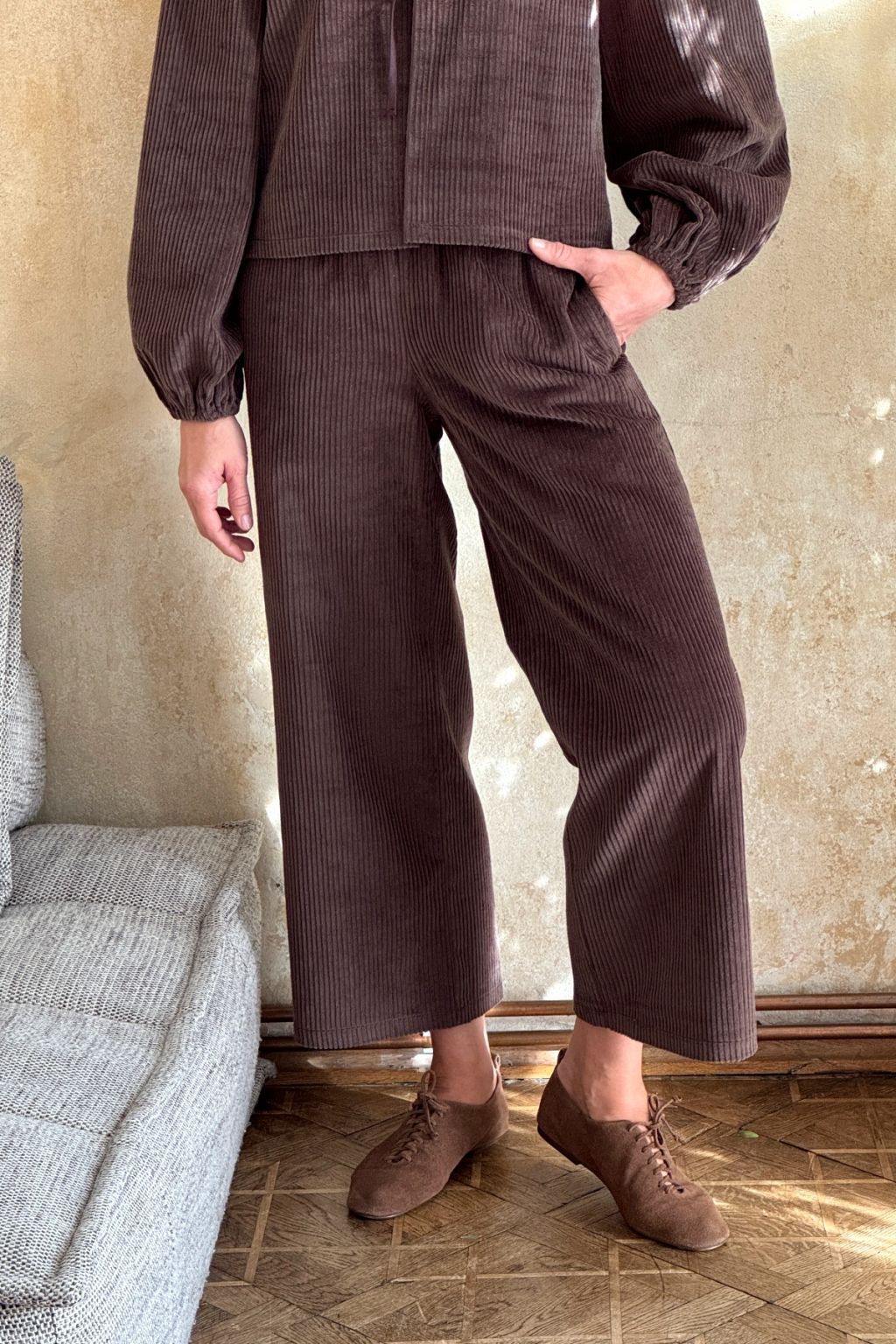Spodnie kuloty uszyte z bawełnianego sztruksu kolorze czekoladowym. Najwygodniejsze spodnie jakie można sobie wyobrazić. Są proste, z szeroką nogawką. W pasie posiadają elastyczną gumka, a po bokach wszyte kieszenie. Świetne pasują do codziennych stylizacji. A z naszą wiązaną marynarką uszytą z tego samego materiału stanowią idealny sztruksowy zestaw na co dzień i nie tylko.