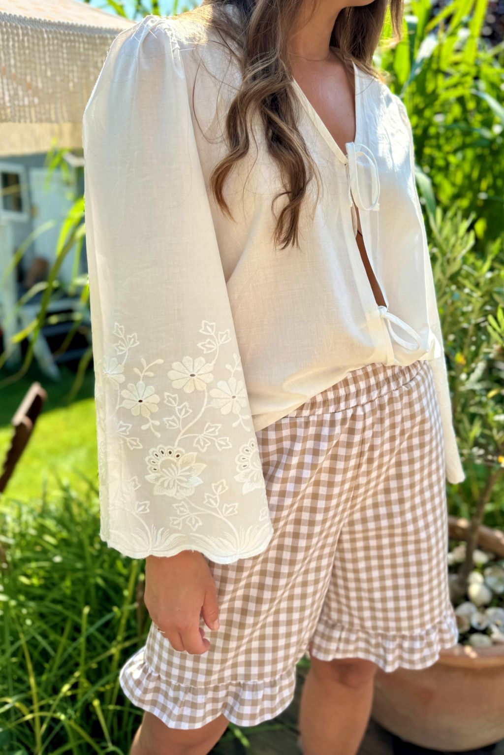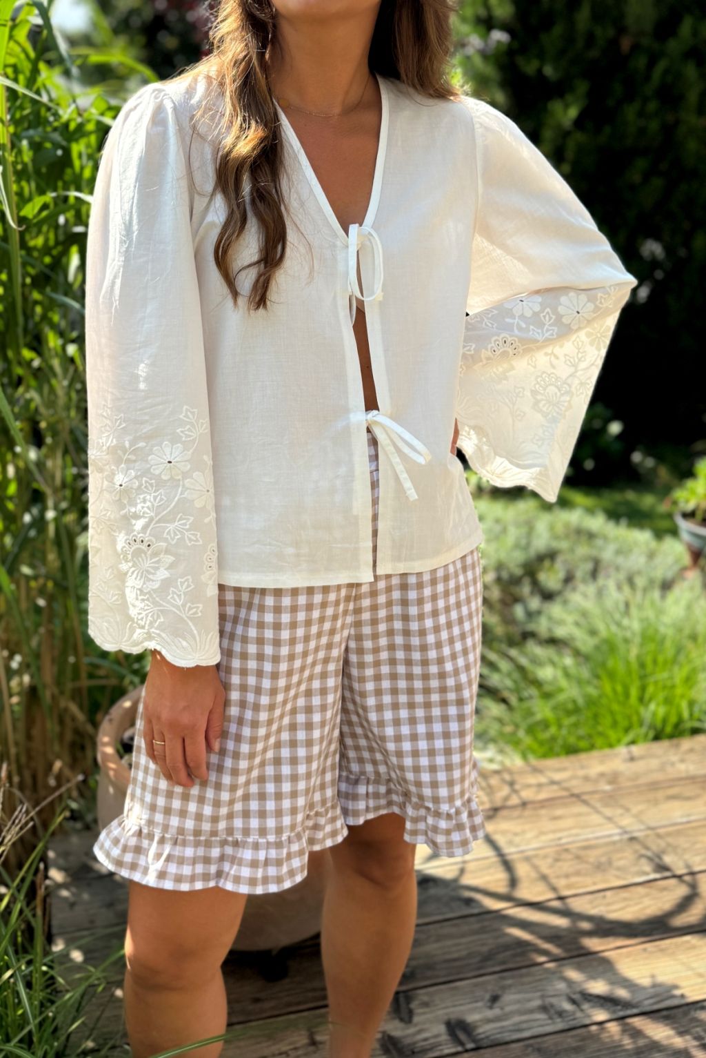 Z naszą koszulą z balonowymi rękawami uszytą z muślinu w haftowane słoneczniki stanowią idealny zestaw weekendowy.