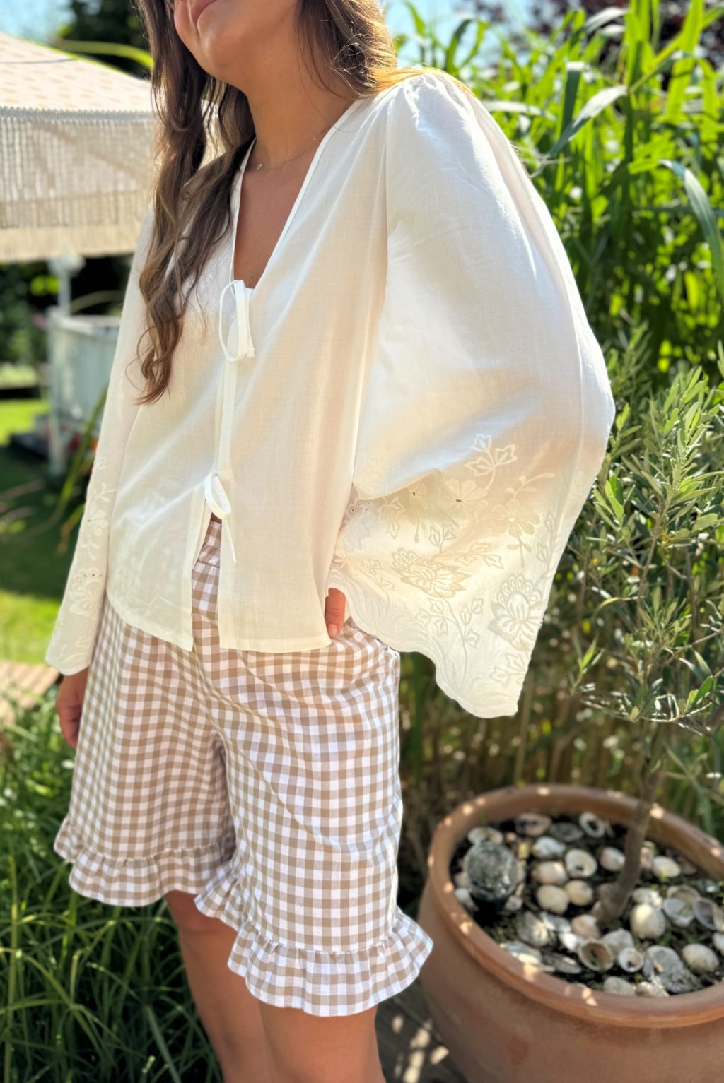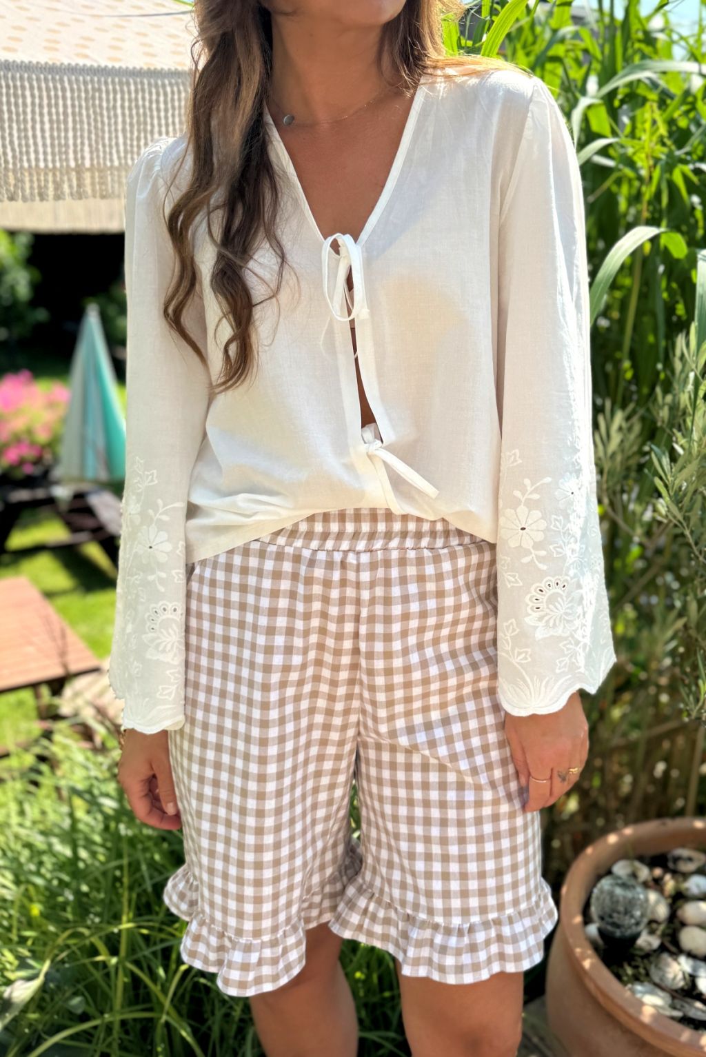 Luźne szorty uszyte z wysokiej jakości bawełny w kratkę w kolorze nude. Po bokach mają wszyte bardzo pojemne kieszenie.