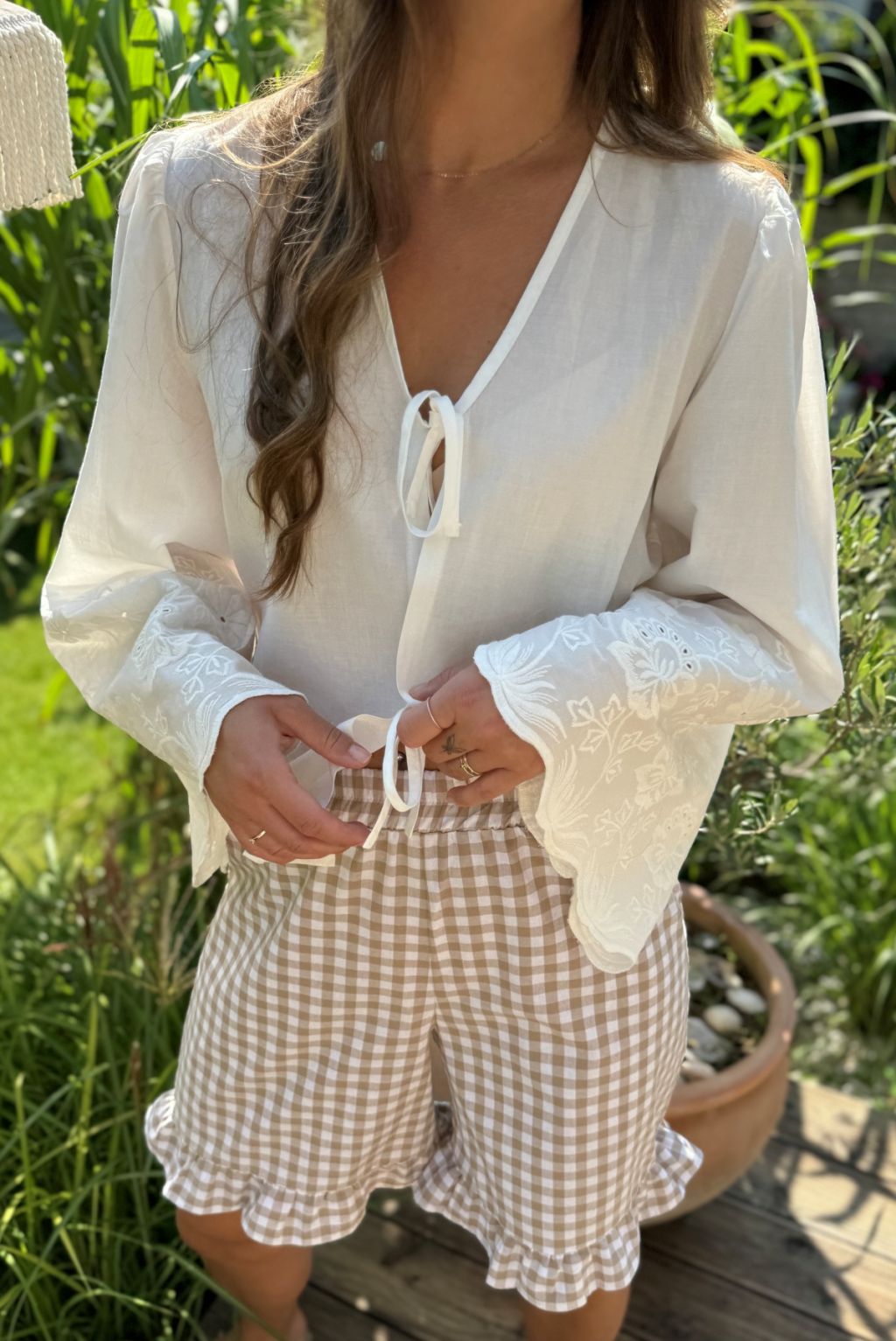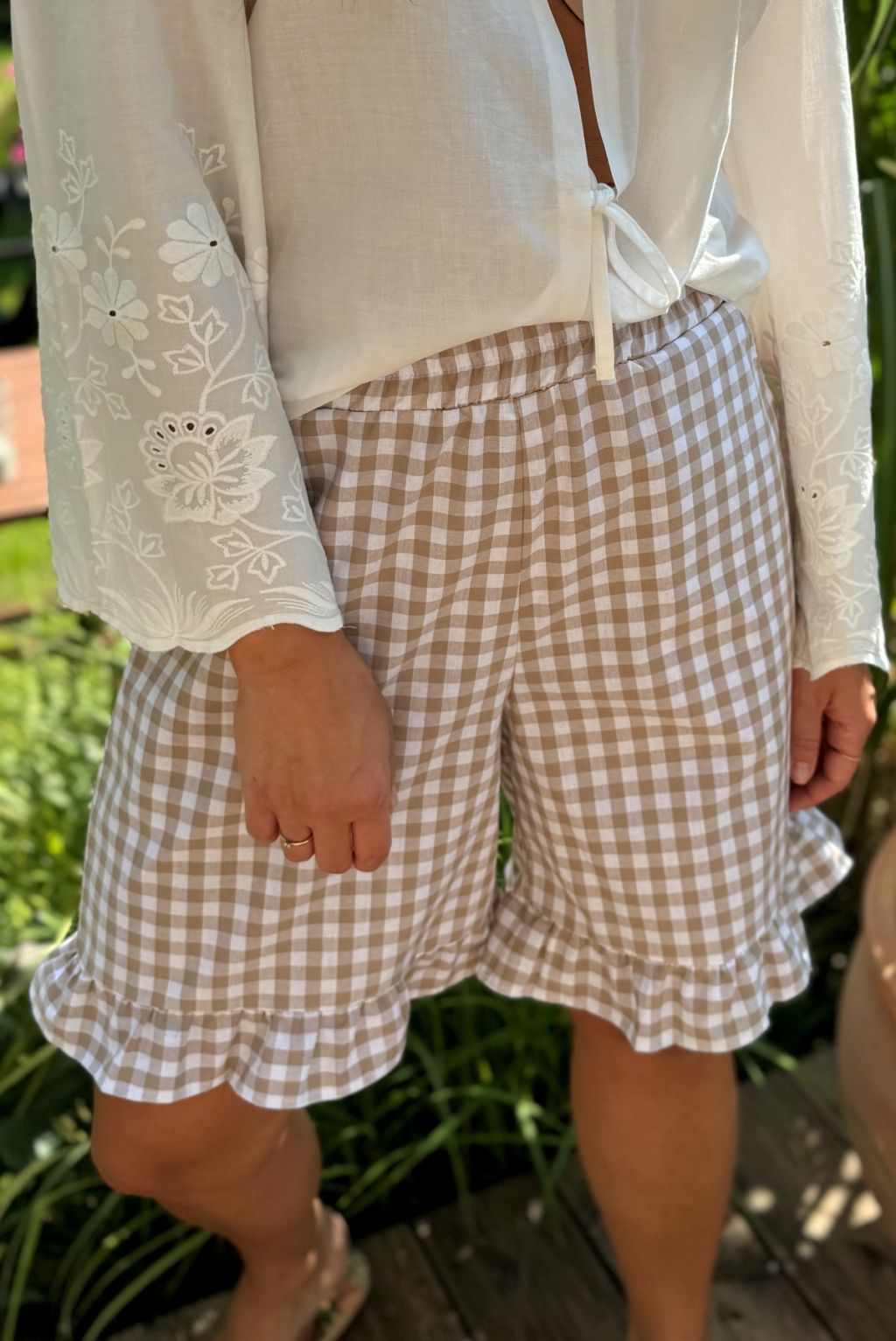 Szorty z falbanką z wyższym stanem w kratkę nude