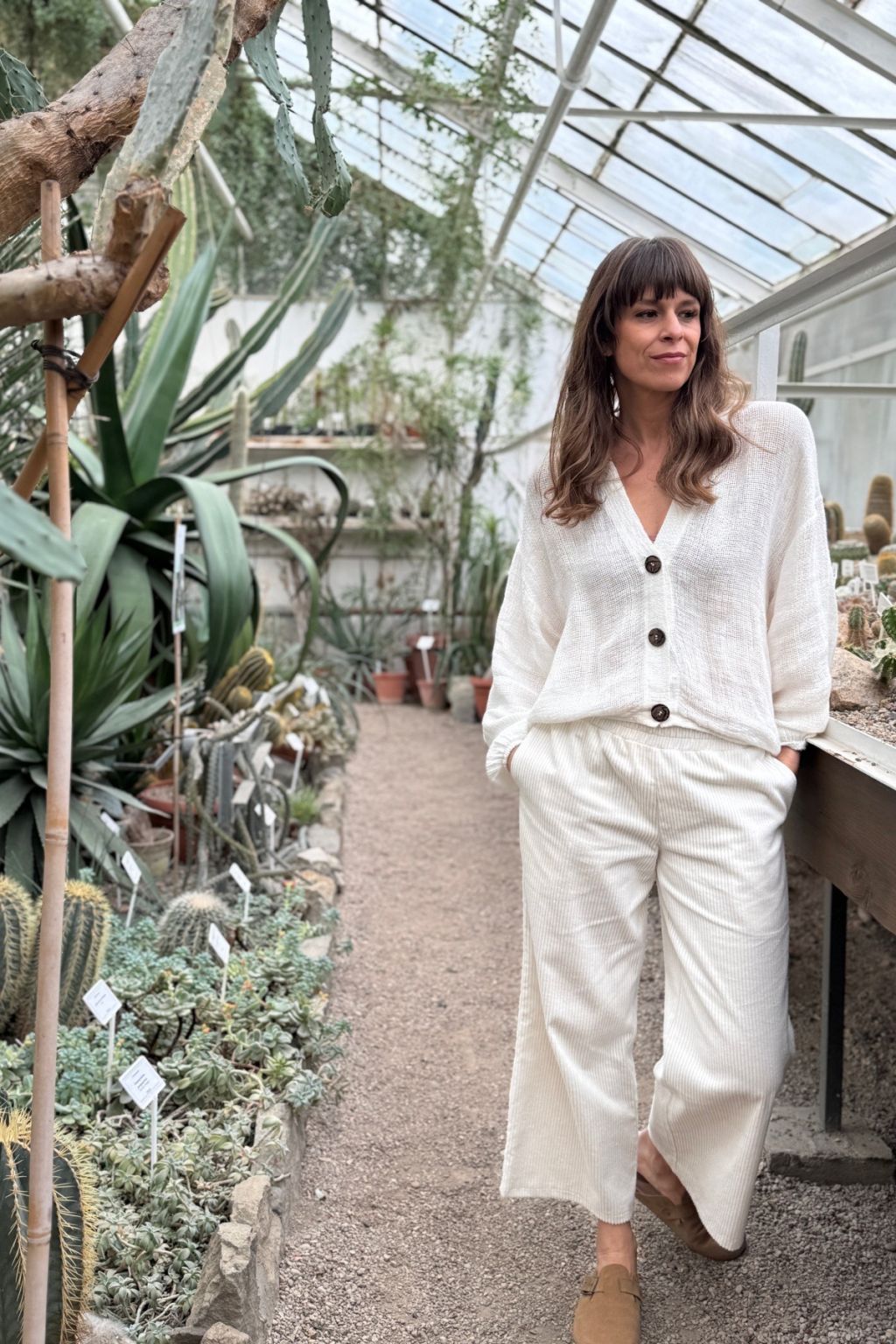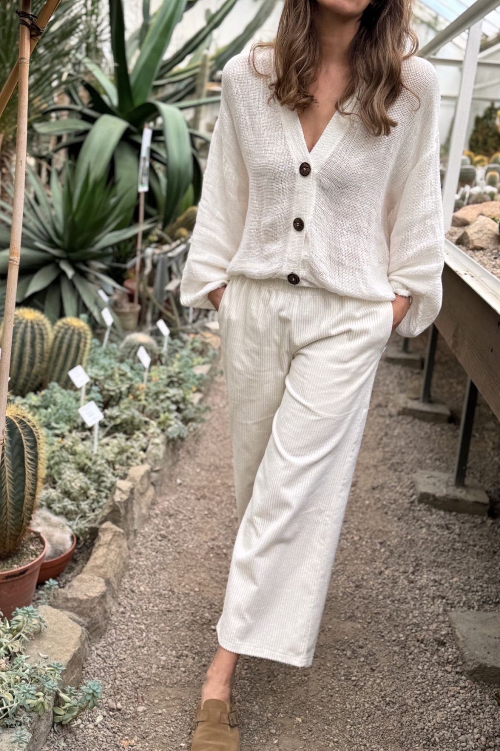 Spodnie uszyte z bawełnianego sztruksu kolorze białym. Najwygodniejsze spodnie jakie można sobie wyobrazić. Są proste, z szeroką nogawką. W pasie jest wszyta gumka, a po bokach mają wszyte pojemne kieszenie. Świetne pasują do codziennych stylizacji. A z naszym kaszmirowym swetrem stanowią idealny zestaw weekendowy :)