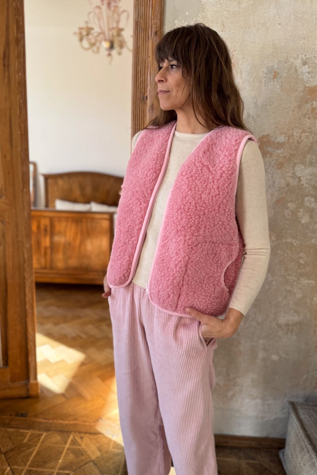 Wełniana kamizelka zapinana na zamek. Posiada po bokach wszyte kieszenie.